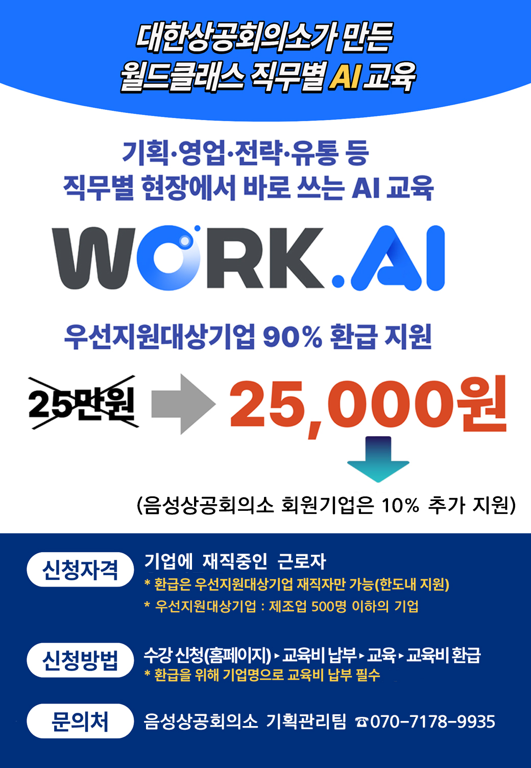 가. 사업명 : 2025년도 재직자 AI 교육사업 나. 교육대상 : 기업에 재직 중인 근로자 다. 교육과정 : 별첨 참고 라. 교육비용 : 1일(7시간)당 25만원(1인 기준) * 우선지원 대상기업 90% 환급 적용(실제 부담금 : 25,000원) * 음성상공회의소 회원기업은 10% 추가 지원(교육비 없음) 마. 신청방법 : www.korcham-workai.net에서 회원가입 후 수강신청 * 15명 이상 단체신청 시, 단독 교육일정 편성 가능(전화 문의) 바. 기타사항 : 본 교육은 실습과정으로 개인 노트북 지참 필수 사. 문의처 : 음성상공회의소 기획관리팀(☎070-7178-9935)